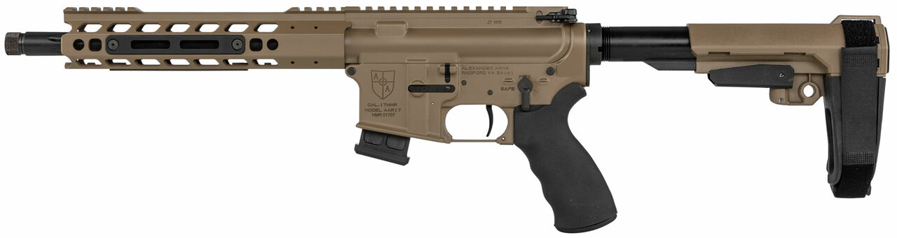 This model of the Highlander Tactical pistol is chambered in .17 HMR, and features a Flat Dark Earth finish. It features a 11″ barrel with a black finish and thread protector muzzle. It has a 10+1 capacity, Manticore Arms Transformer handguard, and SB Tactical SBA3 stock.Brand ALEXANDER ARMS LLC