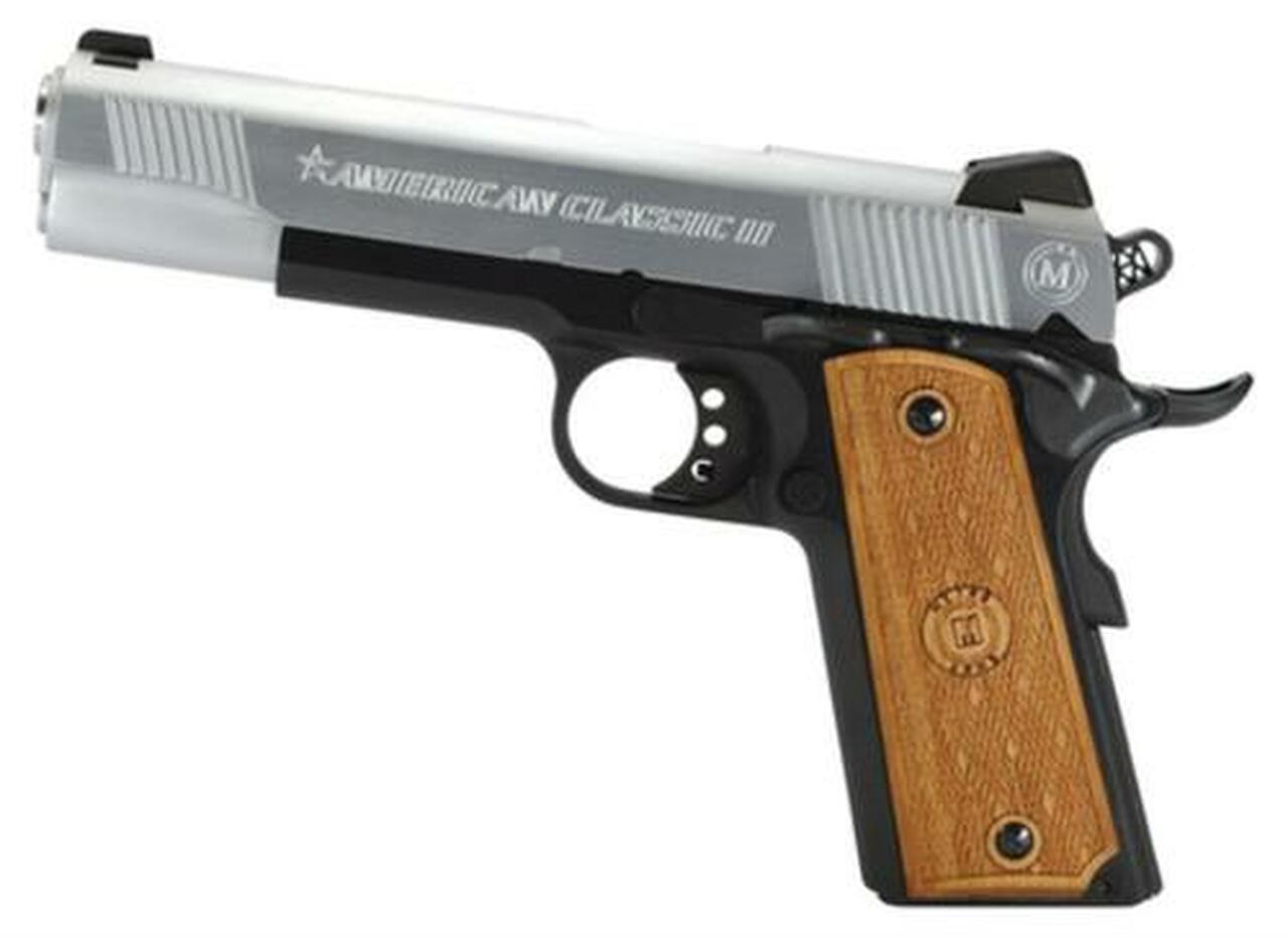 The American Classic AC-II 1911 Pistol in .45 ACP features a 5-inch barrel, hard chrome slide, blued receiver, dovetail front sight, Novak style rear sight, flared ejection port, combat hammer and trigger, extended slide release, single action trigger, an overall length of 8.5 inches, an unloaded weight of 37.28 oz, and an 8+1 round capacity.Category : PistolsType : PistolAction : SingleCaliber : 45 Automatic Colt Pistol (ACP)Barrel Length : 5.0″Capacity : 8+1Safety : Manual Thumb/GripGrips : HardwoodSights : Dovetail Front, Novak RearWeight : 37.3 ozFrame Finish : Blued