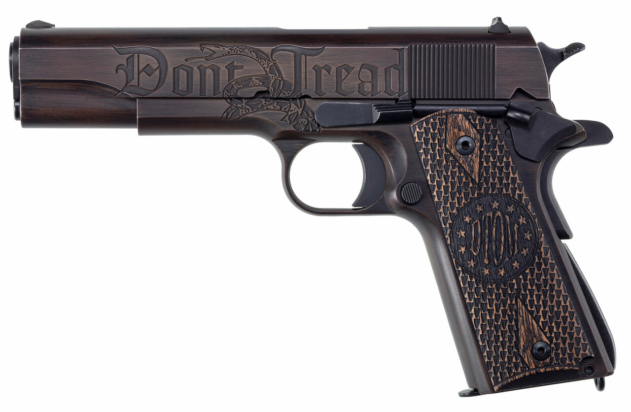 The 1911 Liberty features custom Gonaclo wood grips, custom engraved with Gadsden Flag and “Don’t Tread on Me” motto, finished in a custom Cerakote brown and black. It comes with one 7-round magazine.Caliber : 45 ACP