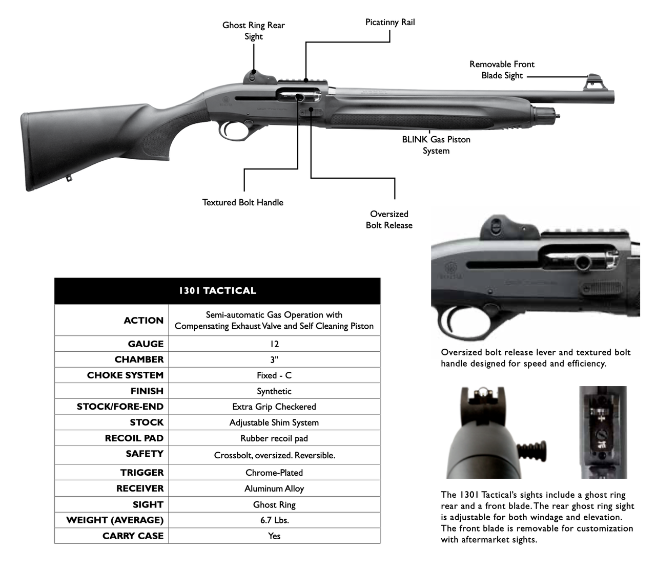 Features an oversized charging handle, large textured bolt release and an oversized reversible safety button. Integrated BLINK gas operating system featuring a cross tube gas piston. Ghost ring rear sight and interchangeable front blade sight. Mil-Std 1913 picatinny rail. Synthetic stock features an aggressive checkering pattern and length of pull is adjustable with the provided spacers. Drop and cast can be adjusted as well. Rubber recoil pad. Crossbolt safety. Chrome-plated trigger.Model 1301 TacticalDescription : 1301 Tactical 12 Gauge 18.5 Inch Barrel Ghost Ring Rear Sight and Interchangeable Front Blade Sight Synthetic Stock Black 4 RoundBarrel Length : 18.5Gauge : 12Catalog Vendor Name : BERETTACapacity : 4Chamber Inch : 3Caliber-Gauge : 12 GA.Fixed cylinder choke