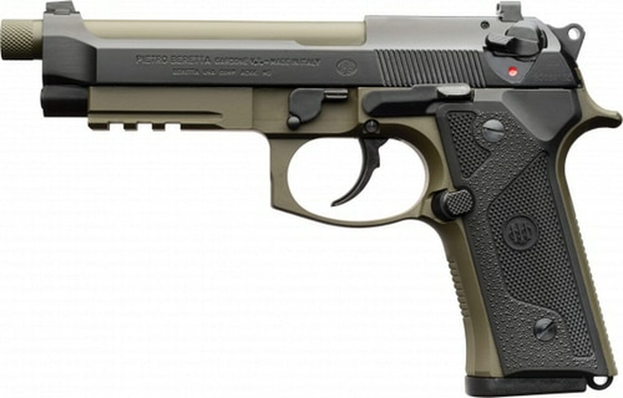 Beretta J92M9A3GM1: With the M9A3 semi auto pistol, Beretta has created a coming-together of all the tactical and functional features that today’s combat professionals may require. The M9A3 was designed to deliver the performance that military, law-enforcement and VIP-protection professionals demand. The Vertec-style vertical grip of the M9A3 offers two very important benefits. Its vertical configuration makes it easy to point the handgun to where one would normally point the index finger of the dominant hand. Also, the grips are thin despite being able to accommodate a double-stack, high-capacity magazine. This makes trigger reach simple even for those with smaller hands, besides offering a more compact profile for those carrying the M9A3 concealed. All this, plus the crisp checkering on the front and backstrap as well as removable wraparound grip, make any combat hold simple and consistent. Included is an unique ammo can packaging. This Type G model features a ambidextrous safety/decocker, a green frame with a black slide finish, night sights, a green 5.2″ threaded barrel, and has a 17-round magazine capacity.Caliber: 9mm