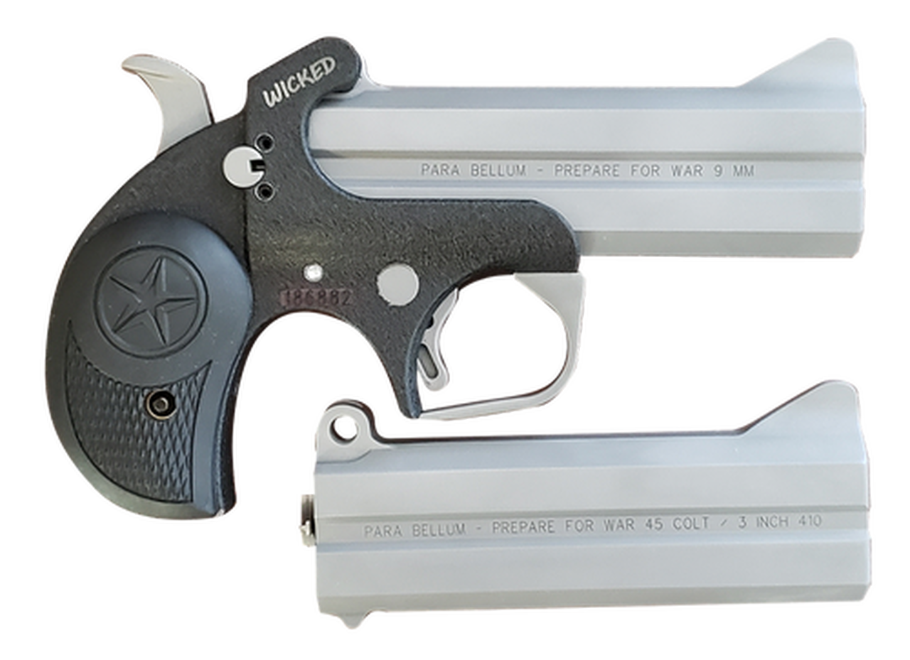 The Bond Arms Wicked is perfect for those Derringer like collectors. It features a black powder coated frame, with a stainless barrel, and black rubber grips with a Bond Arms star. This model comes with a 4.25″ 9mm barrel and a 4.25″ 45/410 barrel. It is a limited production of only 1000 units.Action : DerringerCaliber : 9mm LugerGauge : 410 GaugeCapacity : 2 rdBarrel Lengths : 4.25″Weight : Black RubberMetal Finish : Black