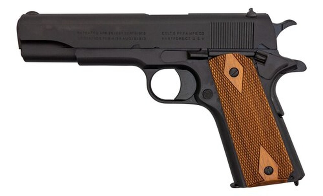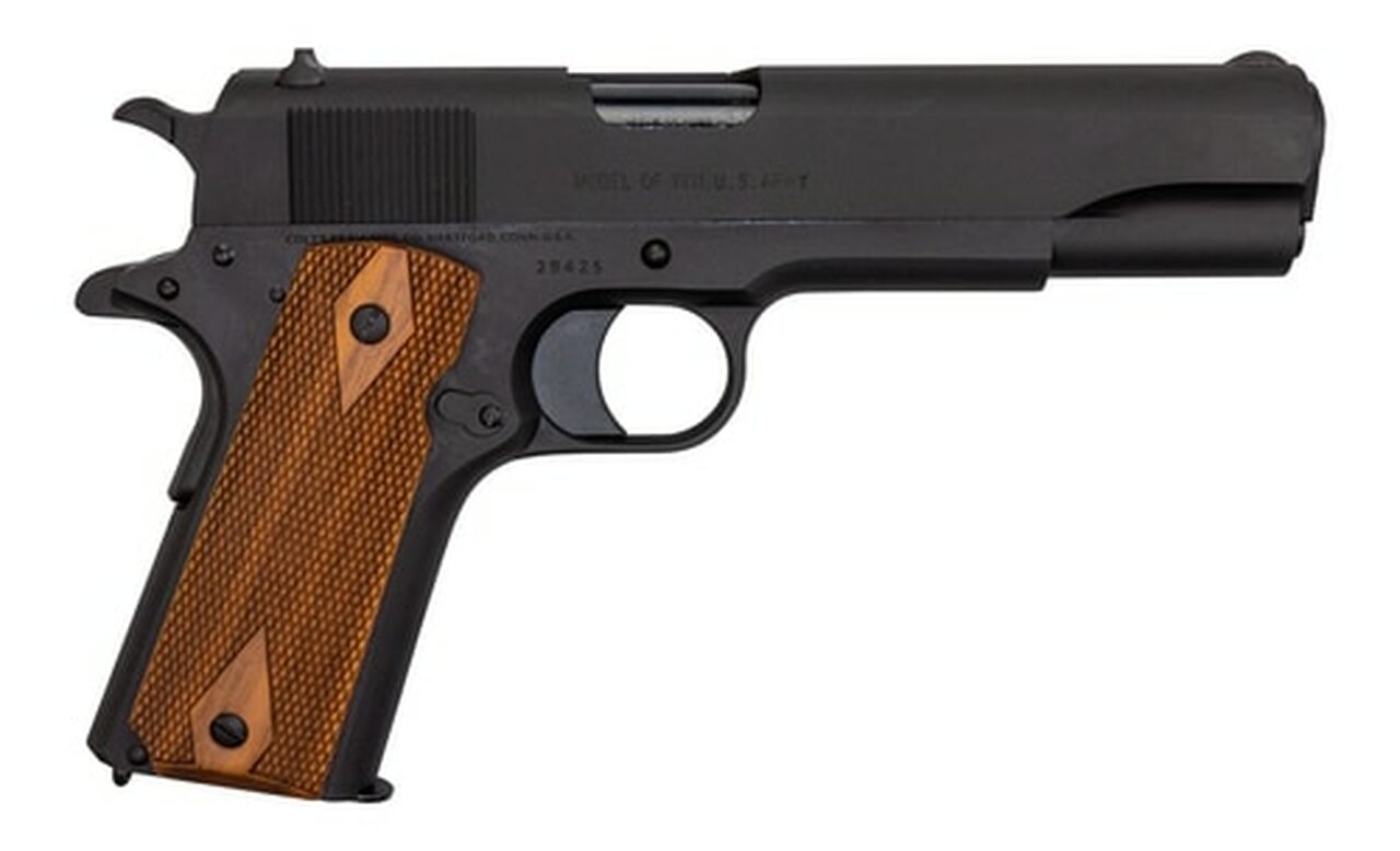 Colt’s Black Army 1911 features a matte blued finish; Colt’s Series 70 firing system; original rollmarks and inspector marks; 5 barrel with wide hood; smooth, straight mainspring housing with lanyard loop; WWI-style manual thumb and grip safety; a tapered blade front sight; forged knurled slide stop; and knurled thumb safety and magazine catch. It is a single action 1911 with a 9+1 capacity.MANUFACTURER: Colt