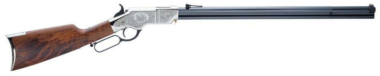 Line by line copy of the original Henry Rifle designed by Benjamin Tyler Henry in 1860. Limited to 1000 units. Right-side main flat displays an American Eagle perched on a Federal Shield including 13 stripes and 13 stars representing the original colonies that formed our nation, clutching the arrows of war in one set of talons and the olive branch of peace in the other set. Features lever toggle link system. Chambered in .44-40. Fancy American walnut buttstock with Nickel plated buttplate. Folding ladder rear and blade front sights. Nickel plated hardened brass receiver.Category : Rifles CenterfireAction : LeverCaliber : 44-40 WinchesterBarrel Length : 24.5″Capacity : 13+1Trigger : StandardSafety : HammerOAL : 43″Weight : 9 lbsStock Description : WalnutMetal Finish : Blued