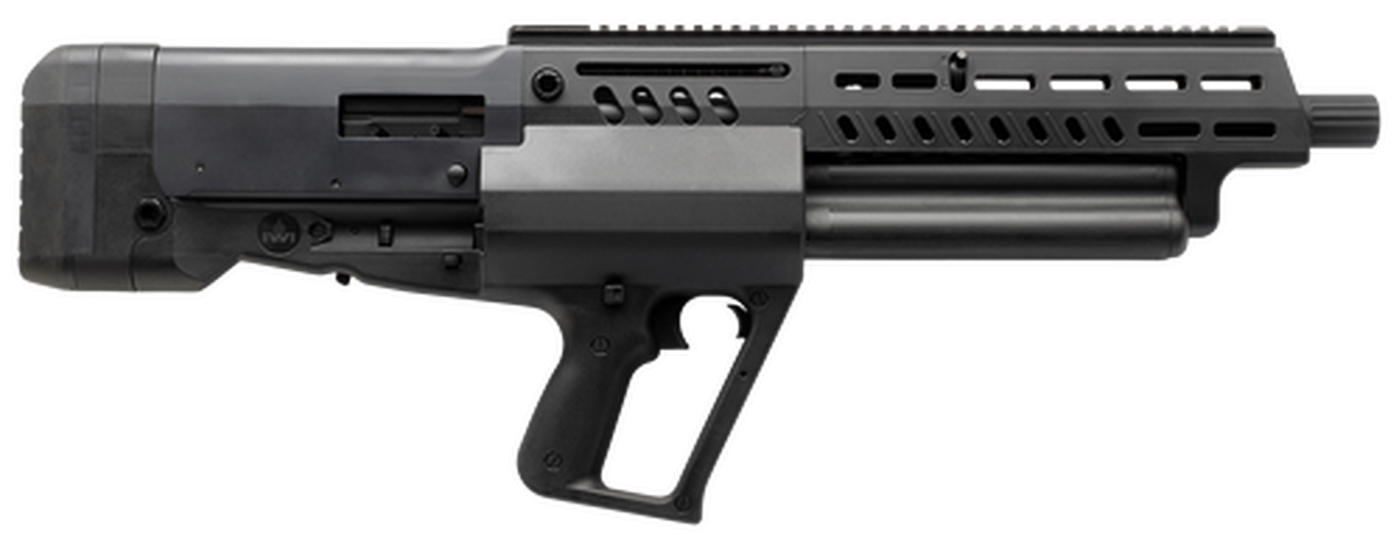 IWI’s Tavor TS12 shotgun features an adjustable gas regulator, 4140 steel barrel with Beretta Multi-Choke threads and is chrome lined. It also has a synthetic stock.