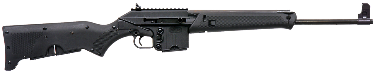 Several unique features make the SU-16 a versatile sporting firearm. ~An integrated Picatinny rail for mounting different sight systems. ~The forend folds down to form a bipod for increased accuracy. ~The stock can store spare magazines, Two 10 rounds magazones or one 20 or 30 rounds. ~The stock and trigger mechanism can be folded forward for added safety and to facilitate secure storage or carry under extreme conditions. The SU-16 has a conventional gas piston operation and utilizes the proven M-16 breech locking system. It is compatible with standard M-16 magazines. The reciprocating bolt handle and magazine catch are on the right side, while the push bolt safety can be changed to work from either side. Except for barrel, bolt and mechanism the SU-16 is made entirely of high impact reinforced polymer. Technical Specifications Caliber: .223 Rem 5.56mm Weight unloaded: 5.0lbs. 2.3kg Length open: 37.4″ 950.0mm Length closed: 26.4″ 670.6mm Barrel length: 18.4″ 467.4mm Magazine capacity: 10 roundsBarrel diameter: 3/4″ to 5/8″ 19.1mm to 15.9mm Twist: 1:9″ 1:228.6mm Bolt travel: 4.1″ 104mm trigger pull: 5lbs. to 7lbs. 22.2N to 31.1N Barrel weight: 26.1oz. 738.8g The model is California legal.