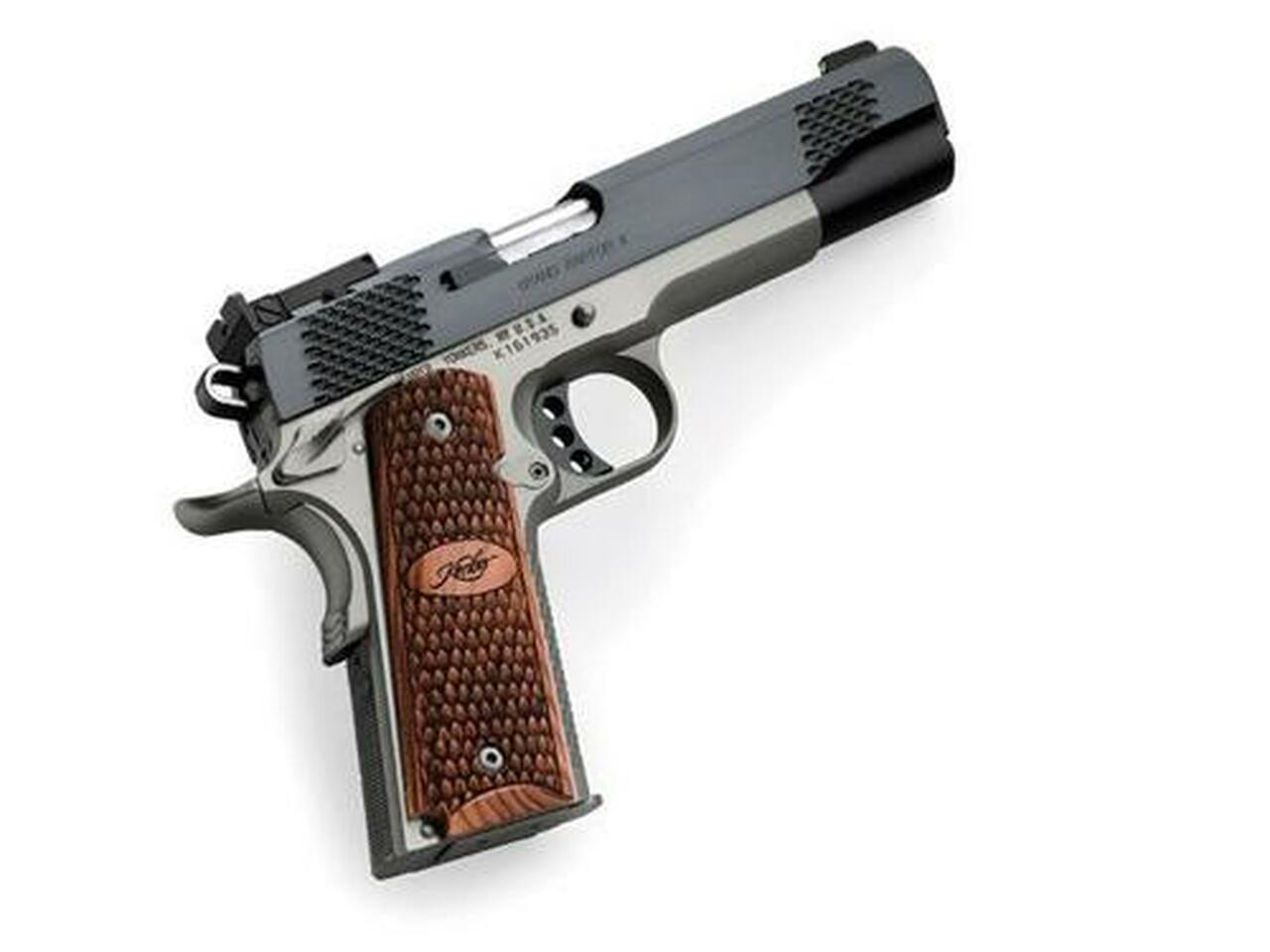A full size 1911 with a 5-inch match grade stainless steel barrel, the Grand Raptor II™ features adjustable night sight, black aluminum match grade trigger, bumped and grooved grip safety and rosewood Raptor grips.