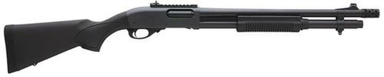 Tactical barrel with ghost ring sights and Rem Choke Tactical extended ported choke tube. XS Ghost Ring sight rail mounts to the receiver. Sight is fully adjustable for windage and elevation. Receiver is milled from a solid block of billet steel. Cycling is regulated by non-binding twin action bars. Black synthetic stock and tactical style forend with sling swivel studs installed.