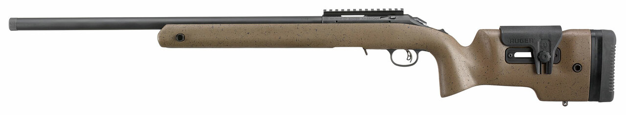 Ruger’s American Rimfire Long-Range Target features a two-tone target stock features a two-way adjustable comb, adjustable length of pull with soft rubber buttpad, QD attachment points and flush mounted lower M-LOK rail. Its easy-to-use, extended magazine release provides smooth, no-fuss removal of the flush-mounted magazine. Patented Power Bedding integral bedding block system positively locates the receiver and free-floats the barrel for outstanding accuracy. The threaded 0.860″ bull barrel with factory-installed knurled thread protector is cold hammer-forged, resulting in ultra-precise rifling that provides exceptional accuracy and longevity. A 60 bolt provides ample scope clearance and the easy-to-use, receiver-mounted bolt release allows the bolt to be readily removed without requiring a pull of the trigger, a unique safety feature among rimfire, bolt-action rifles. It also utilizes a Ruger Marksman Adjustable trigger, tang safety, a factory-installed one-piece aluminum scope rail, and includes sling swivel studs.Caliber 22 LR