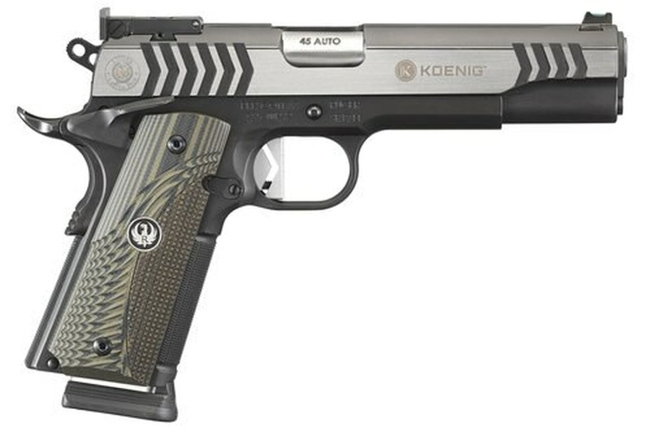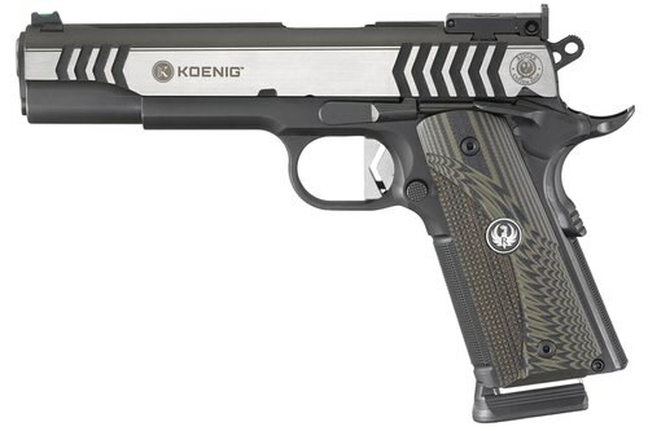 Each slide and frame are hand fitted to ensure that the action is tight, smooth and accurate. The competition barrel featuring a polished throat, fitted barrel lug and target crown is also hand fitted for precise lock-up. The Custom Shop SR1911 is assembled with only the best components, including the Koenig Shooting Sports low-mass hammer and competition sear, flat-faced match trigger shoe, precision-machined Cylinder & Slide disconnector, forged slide stop, integral plunger tube and hand-tuned sear spring. The stainless steel frame’s black nitride finish contrasts with the two-tone, hand-polished, stainless and black nitrided slide with distinctive Ruger Custom Shop markings. Textured G10 grips finish off this rugged and reliable match pistol.