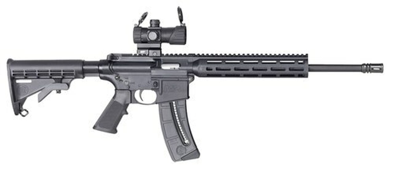Smith & Wesson, M&P15-22, Semi-automatic, AR, 22LR, 16.5″ Threaded Barrel, Black Finish, 25Rd, 10″ M&P Slim Handguard with Magpul M-LOK, MP100 4MOA Red/Green Dot Optic Included