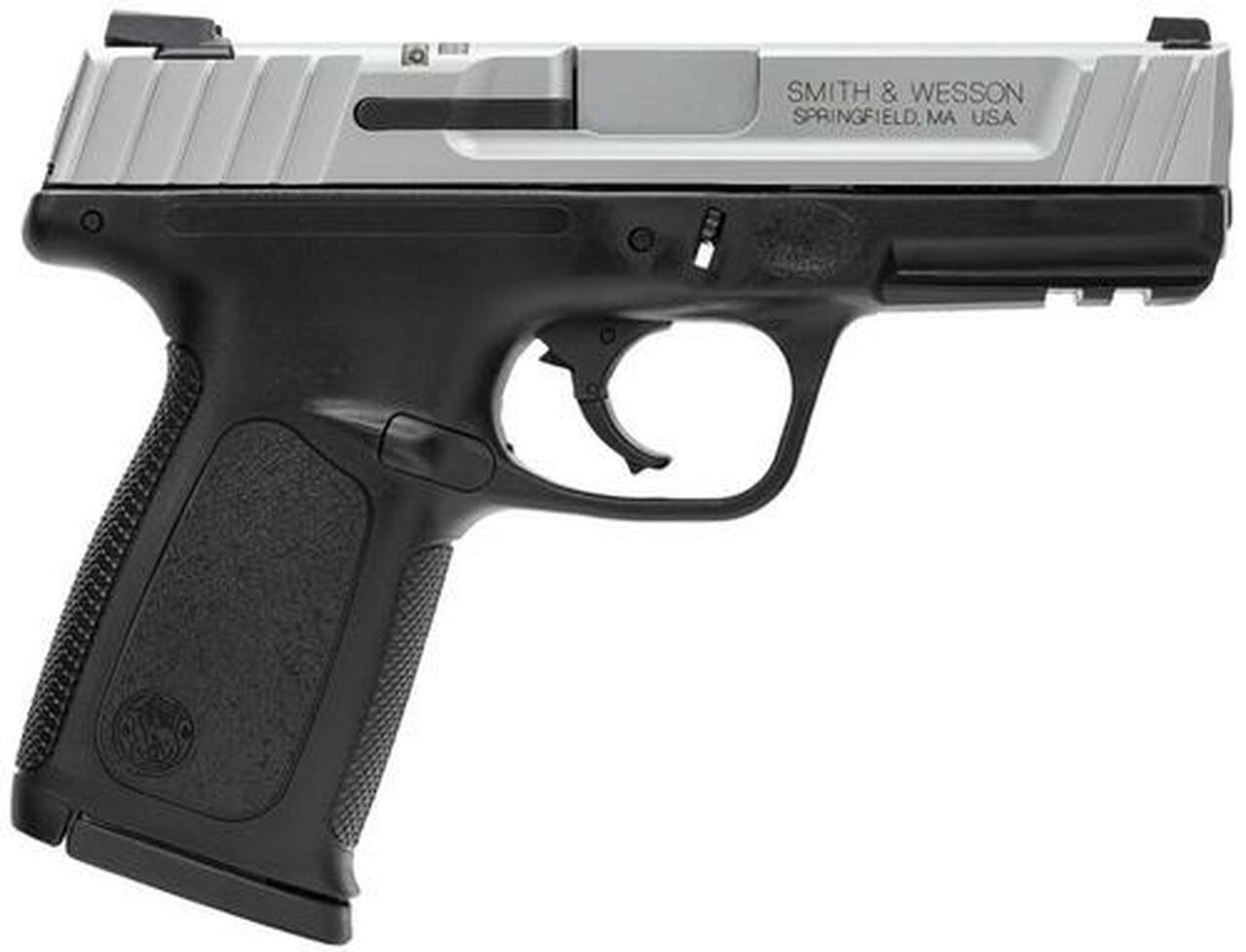 Features & Benefits • SDT – Self Defense Trigger for Optimal, Consistent Pull First Round to Last • Dovetailed, White Dot Sights • Standard, Picatinny-Style Rail • Slim, Ergonomic, Textured Grip • Textured Finger Locator • Aggressive Front and Back Strap Texturing • Distinctive Two-Tone Finish • Front and Rear SerrationsMagazines for current SD are compatible with SDVEALL BACKED BY OUR SMITH & WESSON LIFETIME SERVICE POLICY. Availability subject to applicable federal, state and local laws, regulations, and ordinances.Category : PistolsType : PistolAction : DoubleCaliber : 9mmBarrel Length : 4.0″Capacity : 16+1Safety : No ManualGrips : Black PolymerSights : 3-Dot WhiteWeight : 22.7 ozFrame Finish : Black