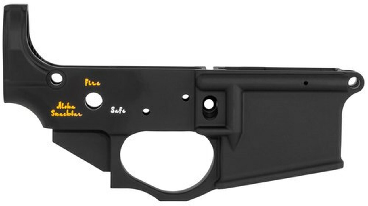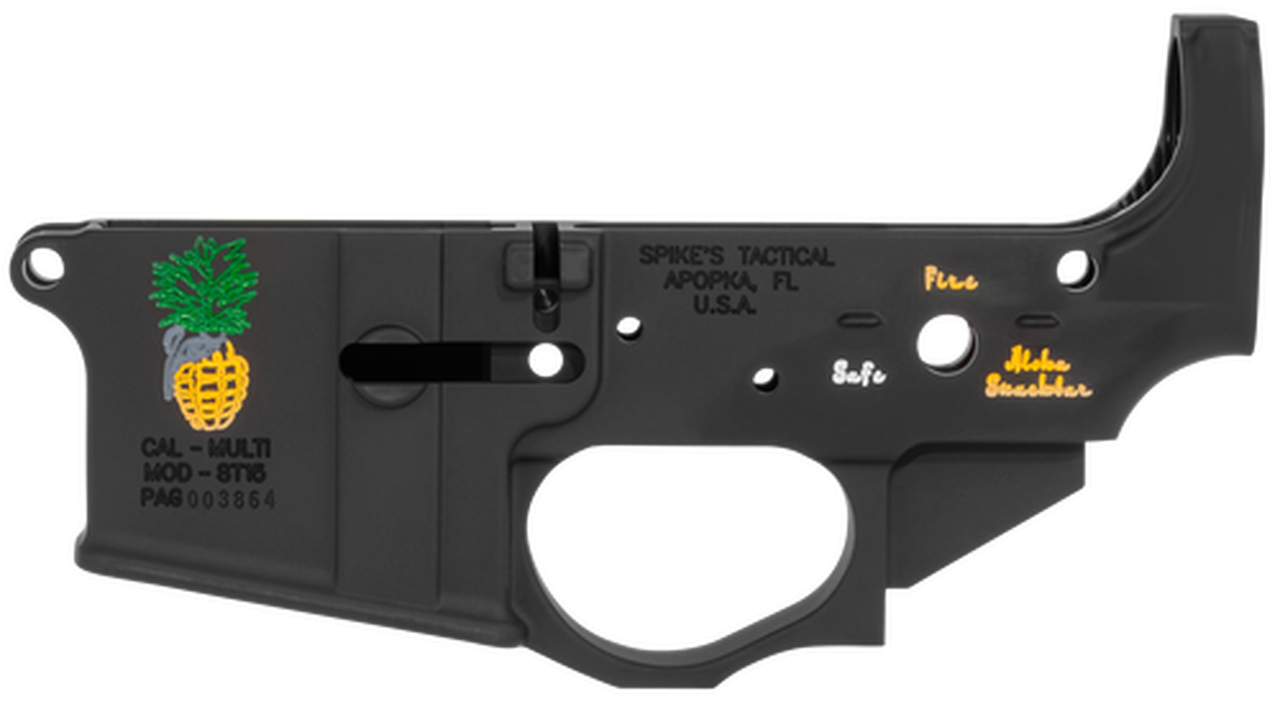 ALOHA SNACKBAR!! Modeled after Spike Industries Pineapple Grenade t-shirt this lower is sure to please all you fruity lovers out there. Pineapple grenade logo, the selector is Safe, Fire, and Aloha Snackbar written in an Arabic style English font.Type : Lower ReceiverGun Type : AR PlatformCaliber : Multi-CaliberMaterial : 7075 T6 AluminumFinish : Black Hardcoat Anodized/Color FillTrigger : None