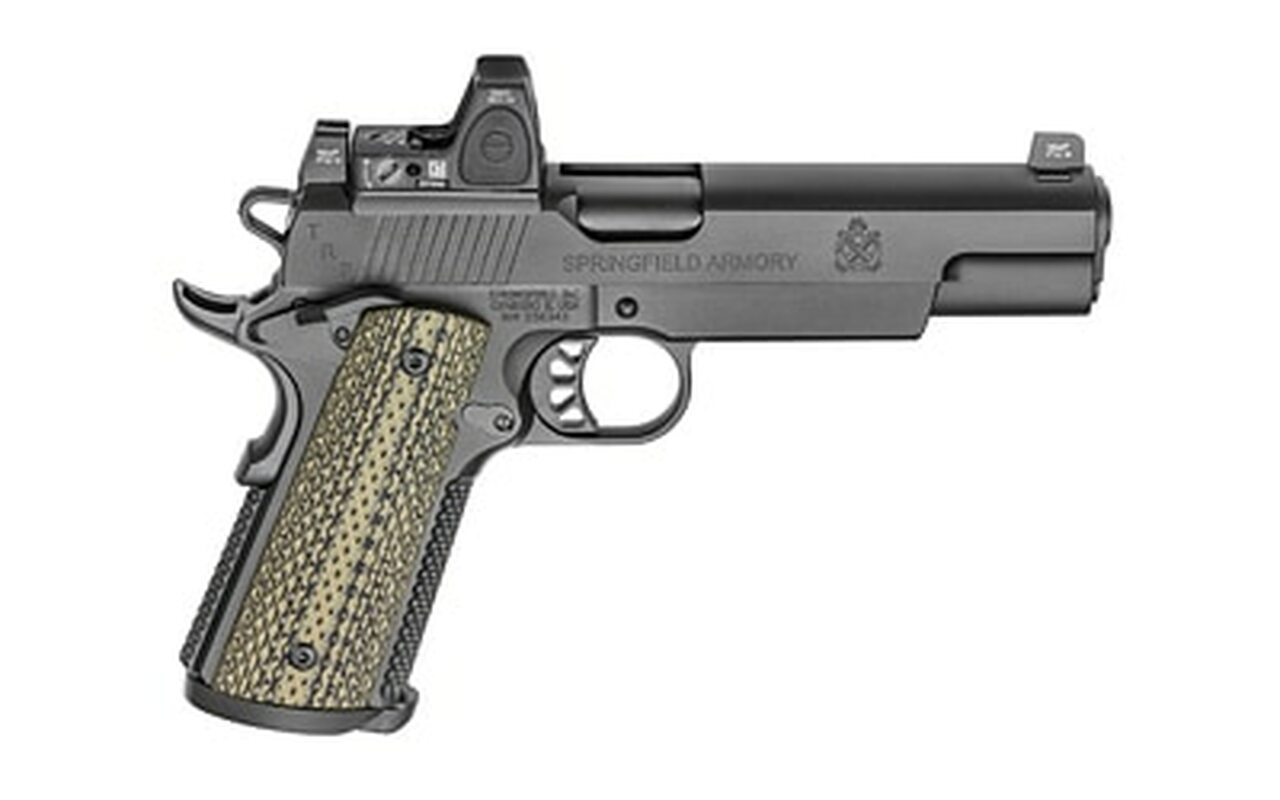Tactical Response Pistol with stainless steel match grade barrel, fully supported ramp with bushings. 3-Dot Tritium nightsight. Gen2 Speed Trigger with a 4.5 to 5 pound pull. GI style 18.5 pound recoil system. Forged steel slide with ball cut and front serrations; Black-T finish. Forged steel frame with integral accessory rail, Octo-Grip front strap and Ambidextrous thumb safety; Black-T finish. VZ Alien, Dirty Olive G-10 grips. Includes two 8-round stainless steel magazines.