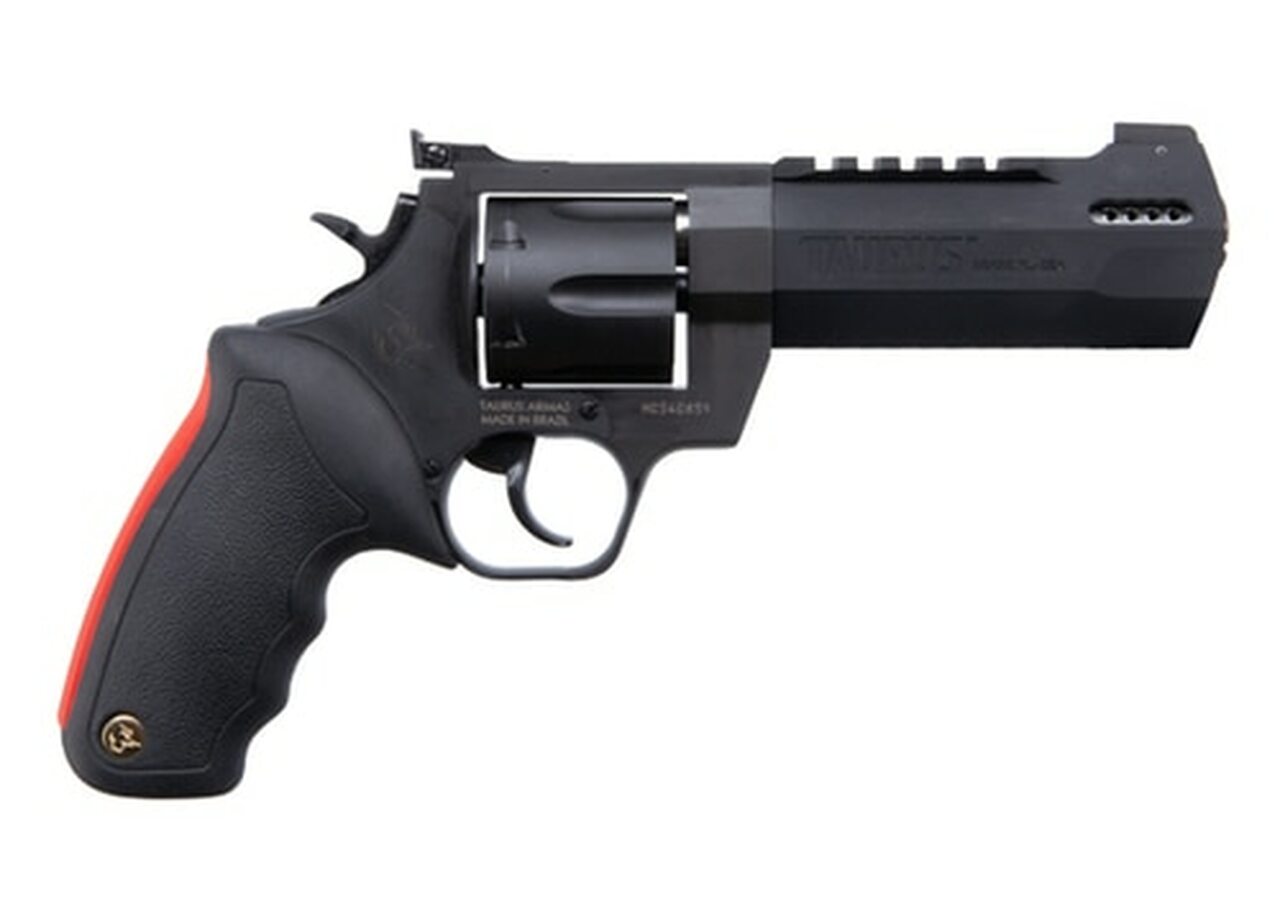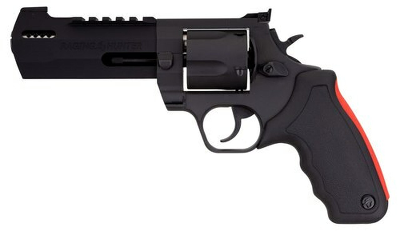 The Taurus Raging Hunter is a 454 Casull, 5-shot revolver. Its striking blue finish is enough to grab the attention of any big-bore aficionado, but the optics-ready Picatinny rail and angular barrel design will seal the deal. The unique barrel system incorporates a steel sleeve that is inserted into an aluminum housing that cuts down on the overall weight, making this a well-balanced hunting sidearm. The exclusive cushioned insert grips on the Raging Series large frame revolvers makes shooting them comfortable and controllable. Also aiding in recoil management is the unique placement of the factory-tuned porting and gas expansion chamber that is designed to disperse gases directionally-reducing muzzle lift and delivering quicker target acquisition. This built-to-last revolver is a fun and effective alternative for short to medium range hunting scenarios.Category : RevolversType : RevolverAction : Single/DoubleCaliber : 454 CasullBarrel Length : 5.125″Capacity : 5Hammer Style : ExposedGrips : Black Rubber Cushion InsertSights : Fiber Optic Front, Adjustable RearFrame Description : Black Aluminum