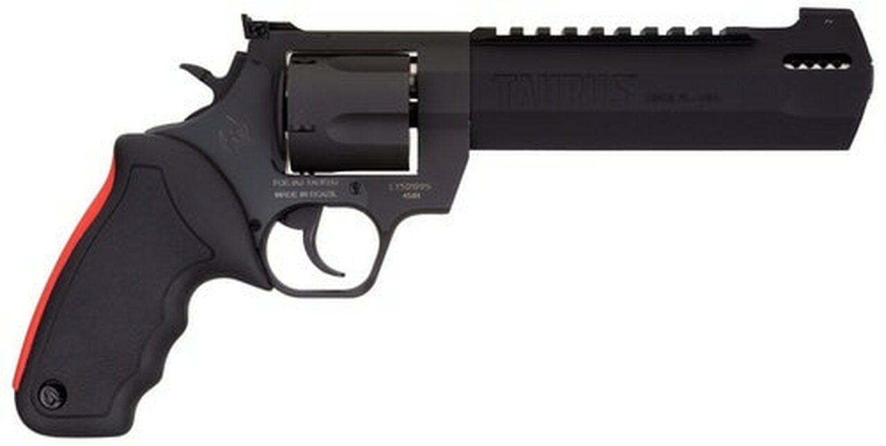 The Taurus Raging Hunter is a 454 Casull, 5-shot revolver. Its striking blue finish is enough to grab the attention of any big-bore aficionado, but the optics-ready Picatinny rail and angular barrel design will seal the deal. The unique barrel system incorporates a steel sleeve that is inserted into an aluminum housing that cuts down on the overall weight, making this a well-balanced hunting sidearm. The exclusive cushioned insert grips on the Raging Series large frame revolvers makes shooting them comfortable and controllable. Also aiding in recoil management is the unique placement of the factory-tuned porting and gas expansion chamber that is designed to disperse gases directionally-reducing muzzle lift and delivering quicker target acquisition. This built-to-last revolver is a fun and effective alternative for short to medium range hunting scenarios.Category : RevolversType : RevolverAction : Single/DoubleCaliber : 454 CasullBarrel Length : 6.75″Capacity : 5Hammer Style : ExposedGrips : Black Rubber Cushion InsertSights : Fiber Optic Front, Adjustable RearFrame Description : Black Aluminum