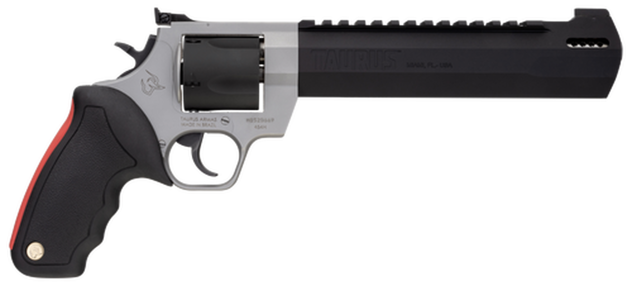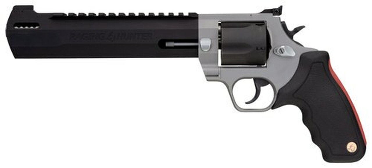 The Taurus Raging Hunter is a 454 Casull, 5-shot revolver. Its striking Stainless and Blue two-tone finish is enough to grab the attention of any big-bore aficionado, but the optics-ready Picatinny rail and angular barrel design will seal the deal. The unique barrel system incorporates a steel sleeve that is inserted into an aluminum housing that cuts down on the overall weight, making this a well-balanced hunting sidearm. The exclusive cushioned insert grips on the Raging Series large frame revolvers makes shooting them comfortable and controllable. Also aiding in recoil management is the unique placement of the factory-tuned porting and gas expansion chamber that is designed to disperse gases directionally-reducing muzzle lift and delivering quicker target acquisition. This built-to-last revolver is a fun and effective alternative for short to medium range hunting scenarios.Category : RevolversType : RevolverAction : Single/DoubleCaliber : 454 CasullBarrel Length : 8.375″Capacity : 5Hammer Style : ExposedGrips : Black Rubber Cushion InsertSights : Fiber Optic Front, Adjustable RearFrame Description : Stainless Aluminum Alloy