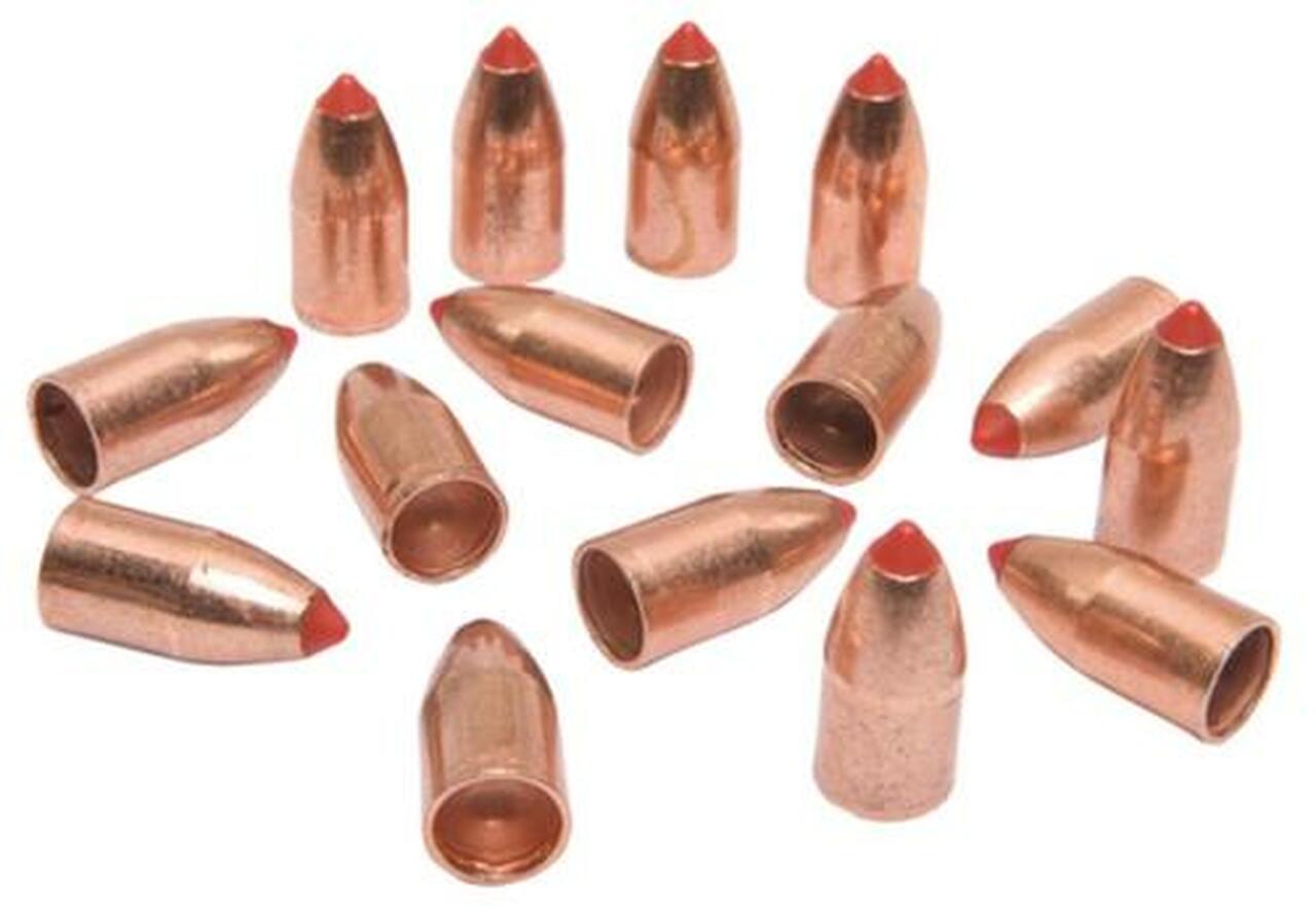 Does not need a plastic Sabot. No lube, copper jacket eliminated lead fouling and controls expansion. Hard hitting FlexTip design. Diameter .499-.507 tapered.