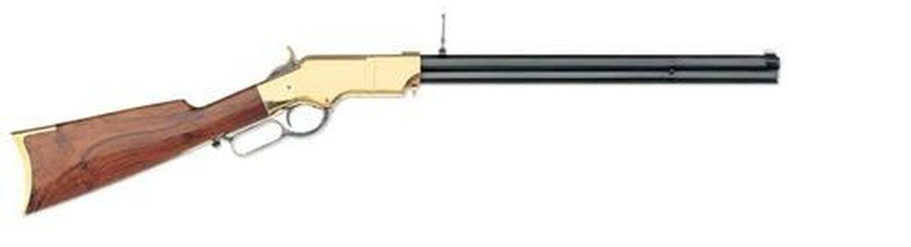 Inventor B. Tyler Henry patented his .44 rimfire lever-action repeating rifle on the eve of the Civil War. While relatively small numbers saw action during the war, the rifle’s battlefield reputation as the “tarnation Yankee rifle that they load on Sunday and fire all week” ensured that it would be a welcome addition to the arsenal of the Old West. Uberti offers the “Trapper” version (18-1/2″ barrel) and Henry Rifle (24-1/4″ barrel). The Rifle is available with a brass frame, color case-hardened steel frame, or the replica of the first 300 units ever made, “The Iron Frame” with a blued receiver.