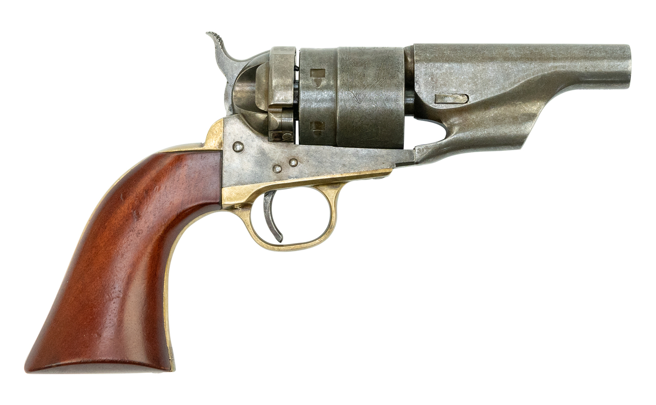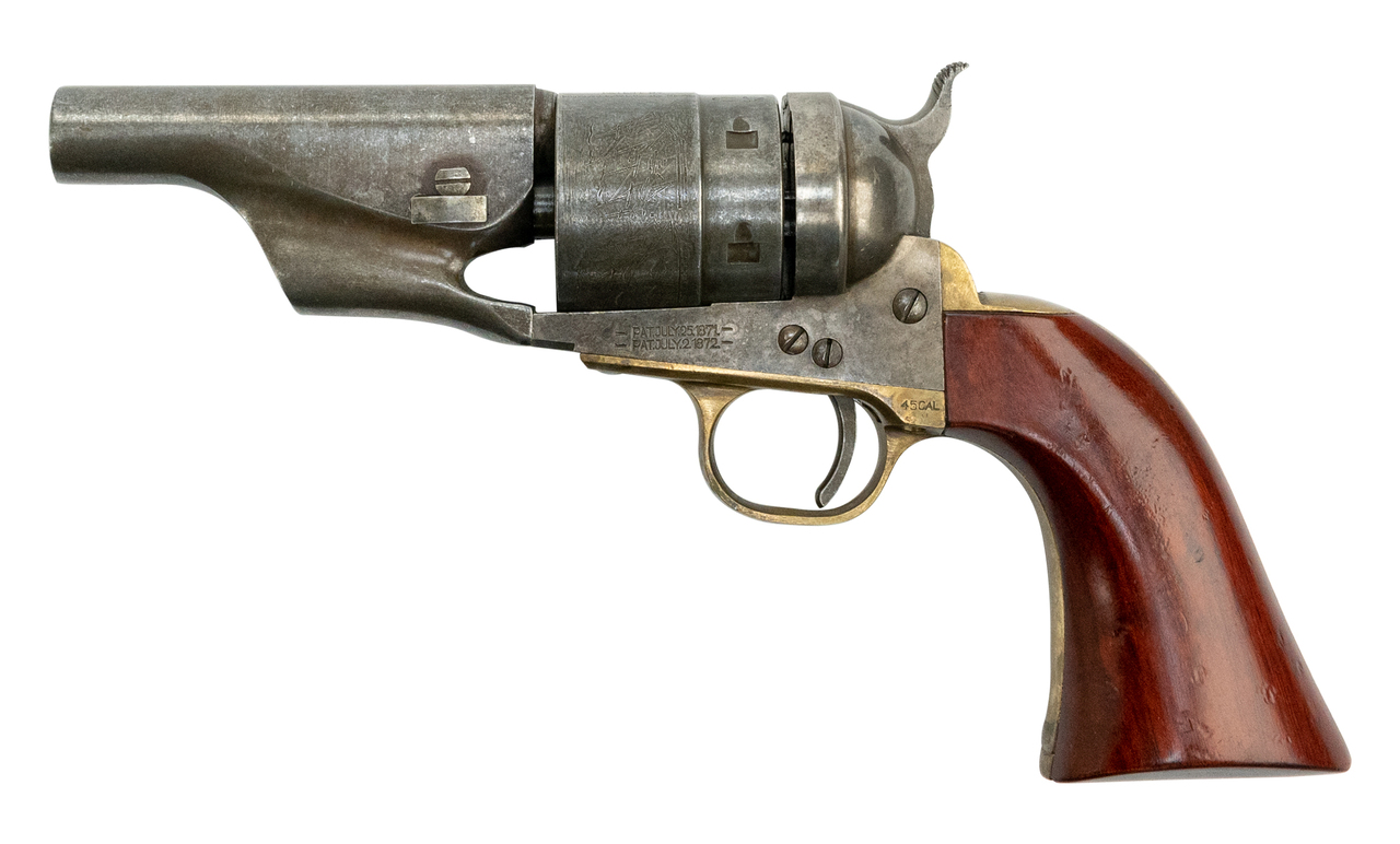 In 1871, an employee from Colt by the name of Charles Richards was awarded a patent for converting Colt percussion models to breech loading cartridge revolvers. The Richards cartridge conversion was an instant success. On July 2nd, 1872, William Mason, another employee from Colt, was awarded a patent for an improvement to the Richards model. As percussion parts ran short, the 1860 Richards-Mason barrel was changed from the profile of the earlier percussion model, to the sleek profile found on the 1871-72 Open Top. The 1858 New Army improved conversion was introduced by Remington in circa 1873 with special factory installed two piece cylinder, leaving the loading lever and adding an ejector.Caliber: .45 Colt