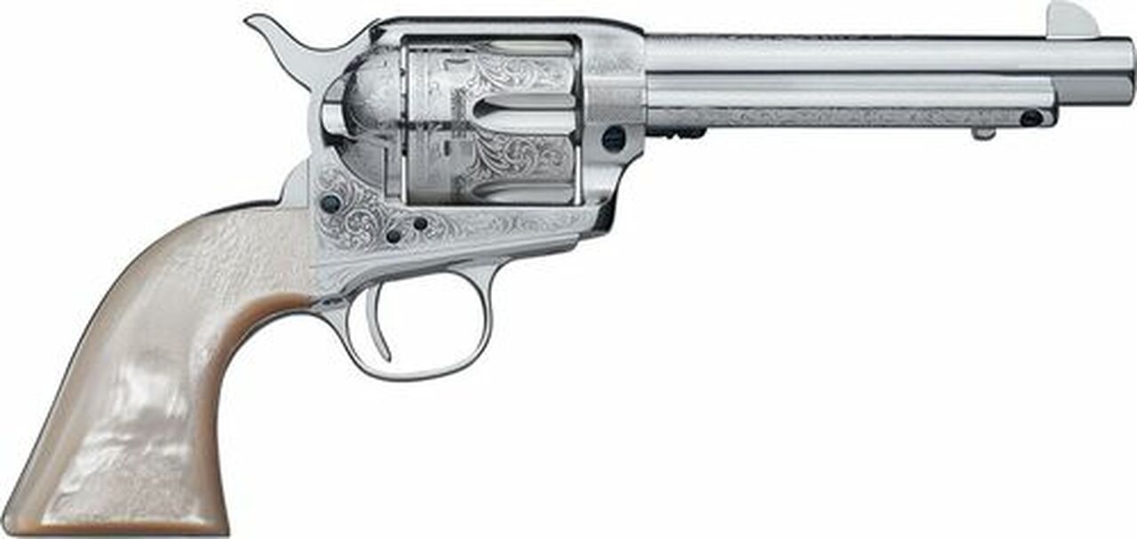 The single-action Army was most widely produced with a color case-hardened frame and blued barrel. Meanwhile, a nickel-plated version was issued to Indian scouts. And a bright charcoal blue finish was available from the factory. But with years of use, the old 6-guns took on a well-handled soft gray patina. All of these classic finishes are available in the 1873 Cattleman.Cylinder: 6-shot, fluted