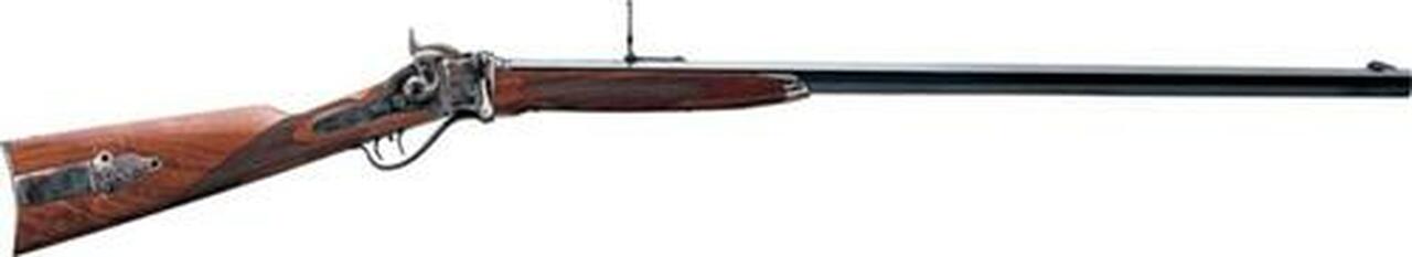 The Creedmoor tang sights used on Sharps rifles were of three heights, depending on the yardage. The lowest, short-range sight was good to 300 yards, mid-range to about 600 yards and the long-range, to about 1,200 yards.SPECIFICATIONS: Number of Grooves: 6 Twist: Right Frame: Case-hardened (except Extra Deluxe) Trigger: Double Set (except Cavalry) Levers and Buttplates: Case-hardened * Round Barrel, all others are Blue Octagonal.†Pewter Fore-end Cap.††Tang mounted Creedmoor sight and Pewter Fore-end Cap.Cavalry is 38.3″ and 8 lbs. Cavalry has Case-hardened Levers and Blue Buttplate.Other Lengths: 46.9″, 48.9″, 50.9″ Weights: 10.25-11 lbs.