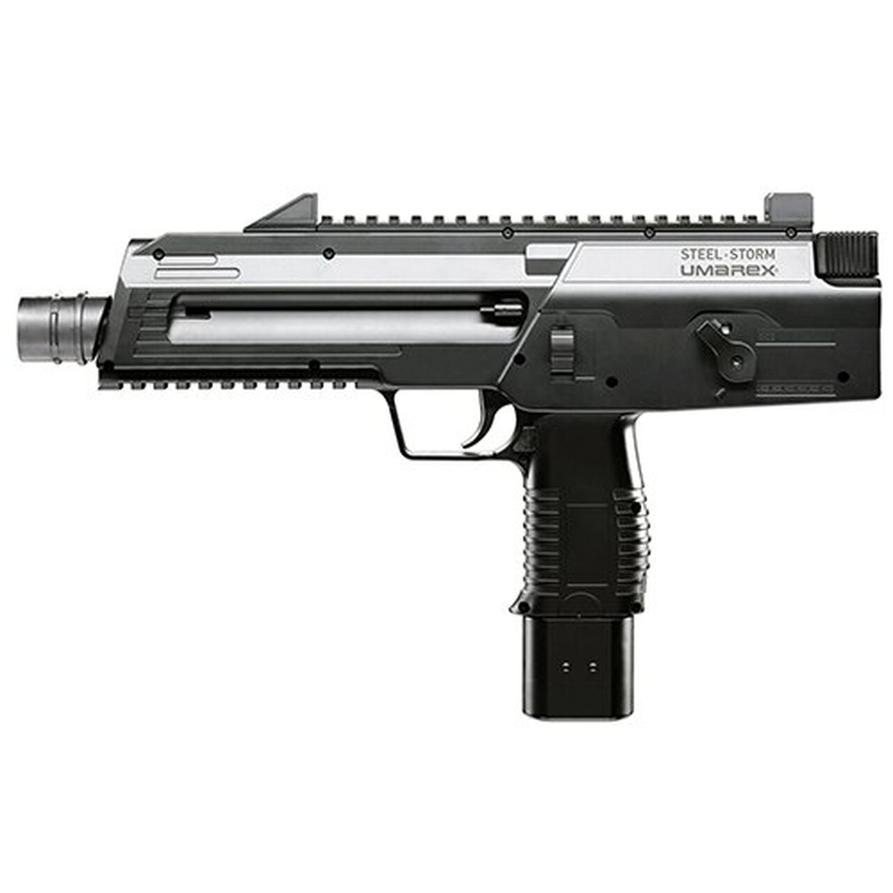 The Umarex Steel Storm Tactical BB gun has a 30 shot capacity, with a 300-round reserve! It allows you to shoot 6-shot bursts in “full-auto” mode, and single shots in semi-auto mode. The gun gives the feel of a real gun with real blowback action. The gun is powered by dual 12 g CO2 capsules (not included), and the CO2 is housed in a drop out magazine for ease of access.